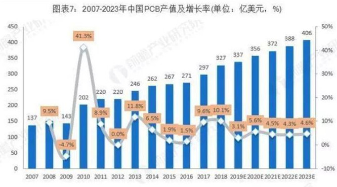 據(jù)Prismark預(yù)測(cè),未來(lái)5年亞洲將繼續(xù)主導(dǎo)全球PCB市場(chǎng)的發(fā)展,而中國(guó)的核心地位更加穩(wěn)固,中國(guó)大陸地區(qū)PCB行業(yè)將保持4.4%的復(fù)合增長(zhǎng)率,至2023年行業(yè)總產(chǎn)值將達(dá)到405.56億美元。在PCB公司"大型化、集中化"趨勢(shì)下,已較早確立領(lǐng)先優(yōu)勢(shì)的大型PCB公司將在未來(lái)全球市場(chǎng)競(jìng)爭(zhēng)中取得較大優(yōu)勢(shì)。